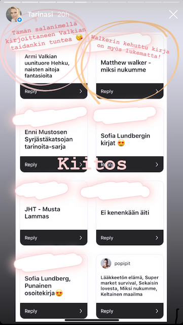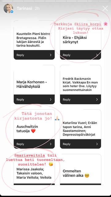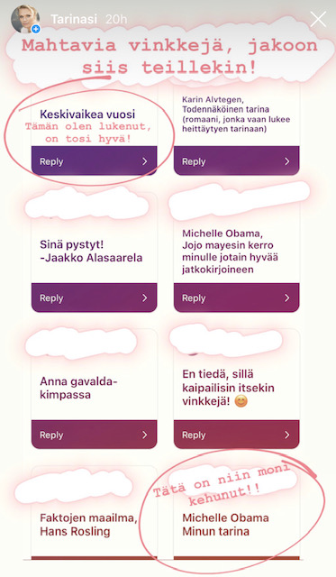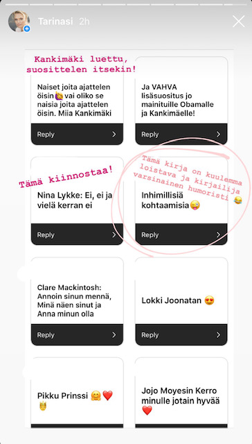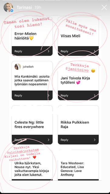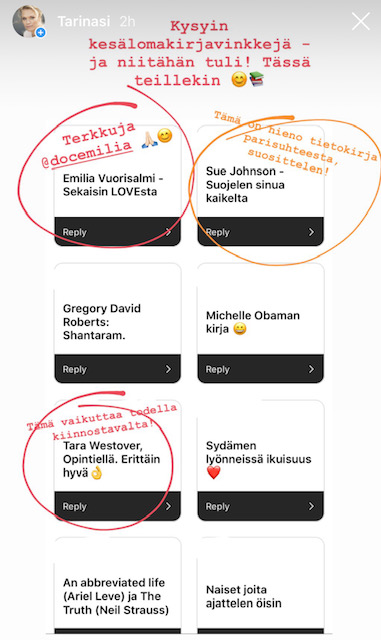 Kysyin Instagramissa suosituksia kesälomalukemisiksi ja niitähän todella tuli. Tässä siis kuvina lista vinkkejä ja Instagramin kohokohdistani löydät myös omia aiempia kirjasuosituksiani. Viikon #mielitekona kysele mieleltäsi tarkkaan kuunnellen, millaiselle lukemiselle olisi tänä kesänä tarve?